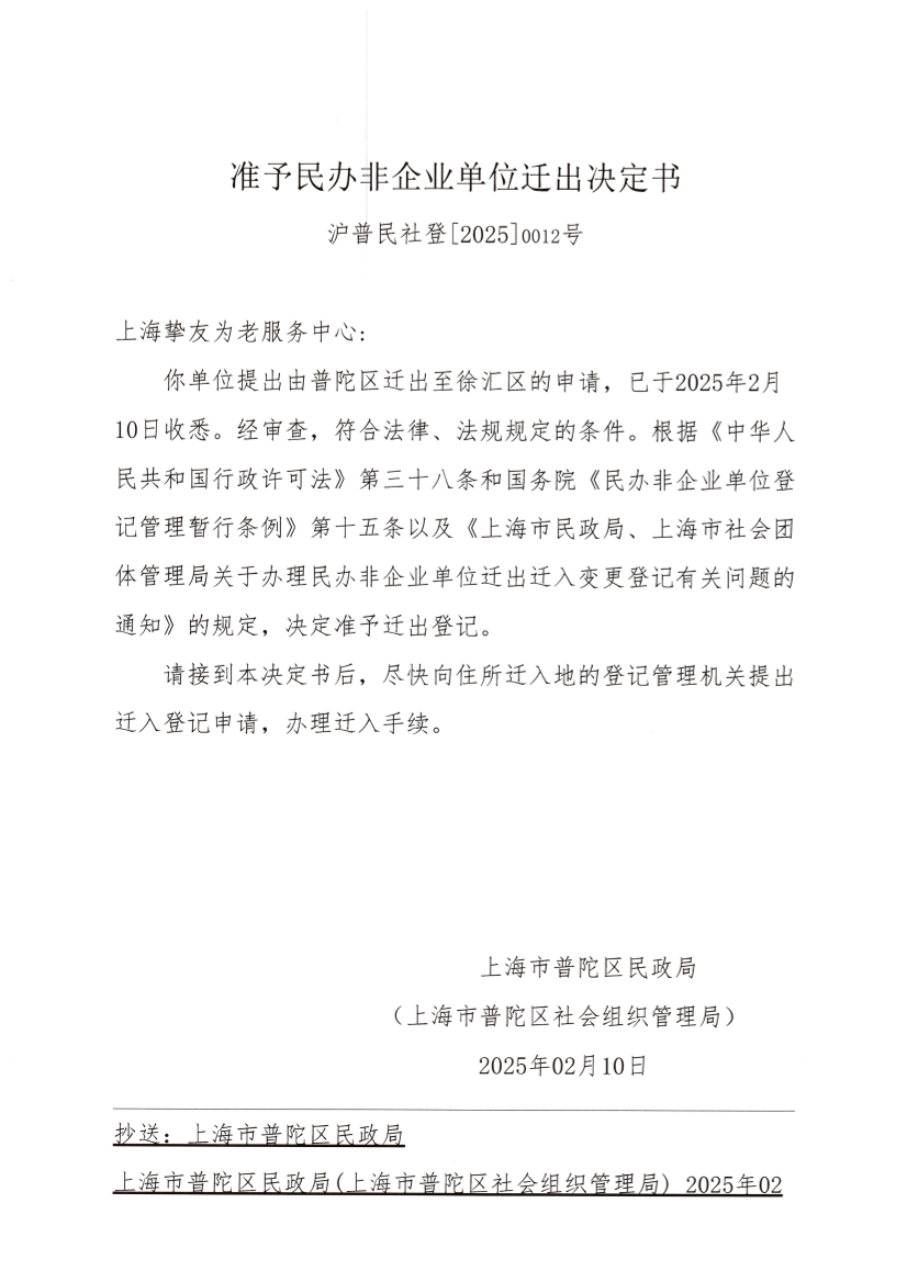 你单位提出由普陀区迁出至徐汇区的申请,已于2025年2月10日收悉。经审查,符合法律、法规规定的条件。根据《中华人民共和国行政许可法》第三十八条和国务院《民办非企业单位登记管理暂行条例》第十五条以及《上海市民政局、上海市社会团体管理局关于办理民办非企业单位迁出迁入变更登记有关问题的通知》的规定,决定准予迁出登记。