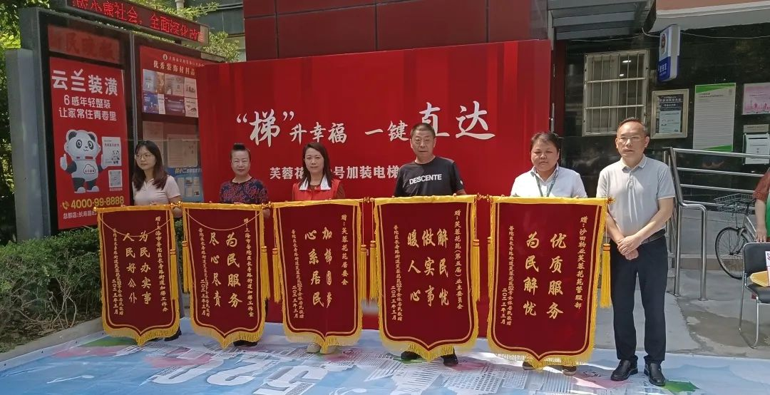 居民代表向街道加梯办、健梯工作室、芙蓉花苑居委会、业委会、物业负责人颁发锦旗