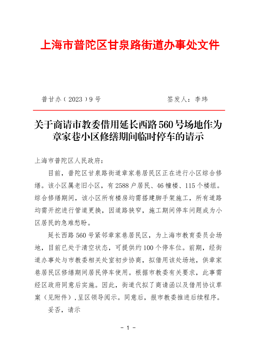 附件:1.普陀区人民政府关于商请上海市教育委员会借用延长西路560号场地作为章家巷小区修缮期间临时停车的函(代拟稿)