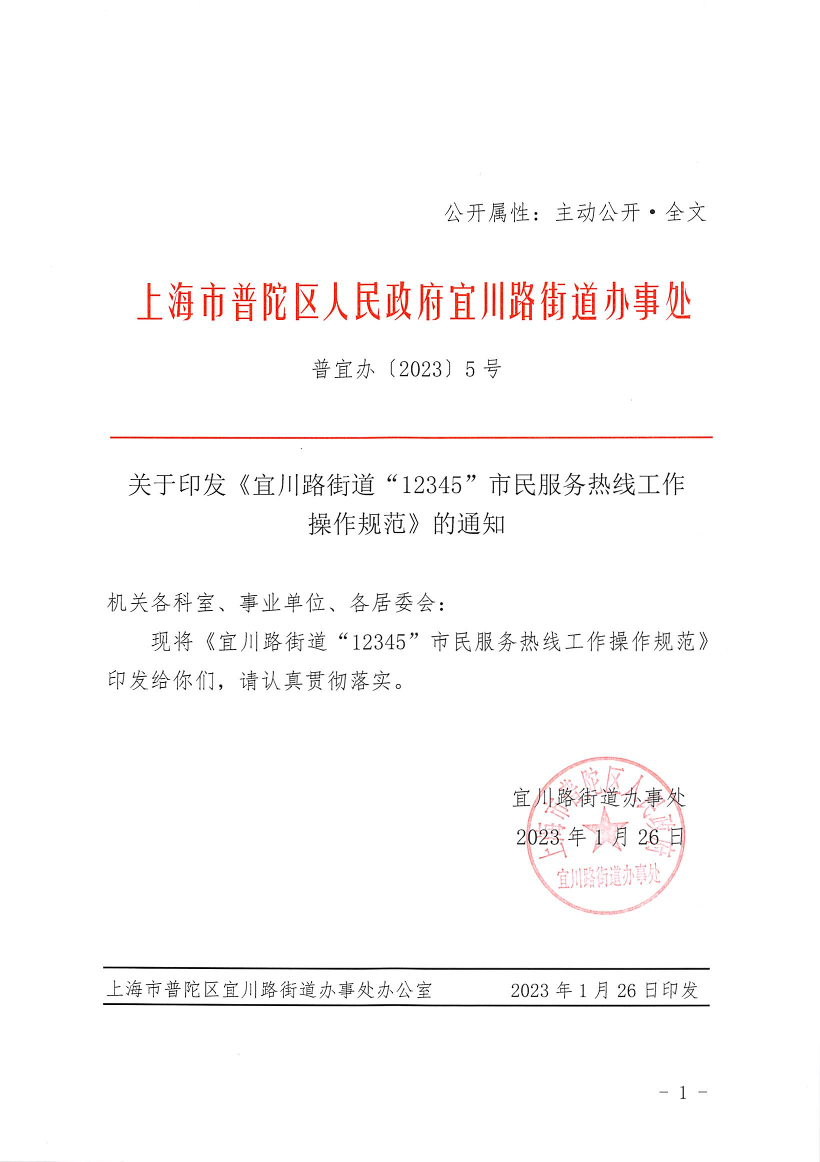 关于印发《宜川路街道“12345”市民服务热线工作操作规范》的通知