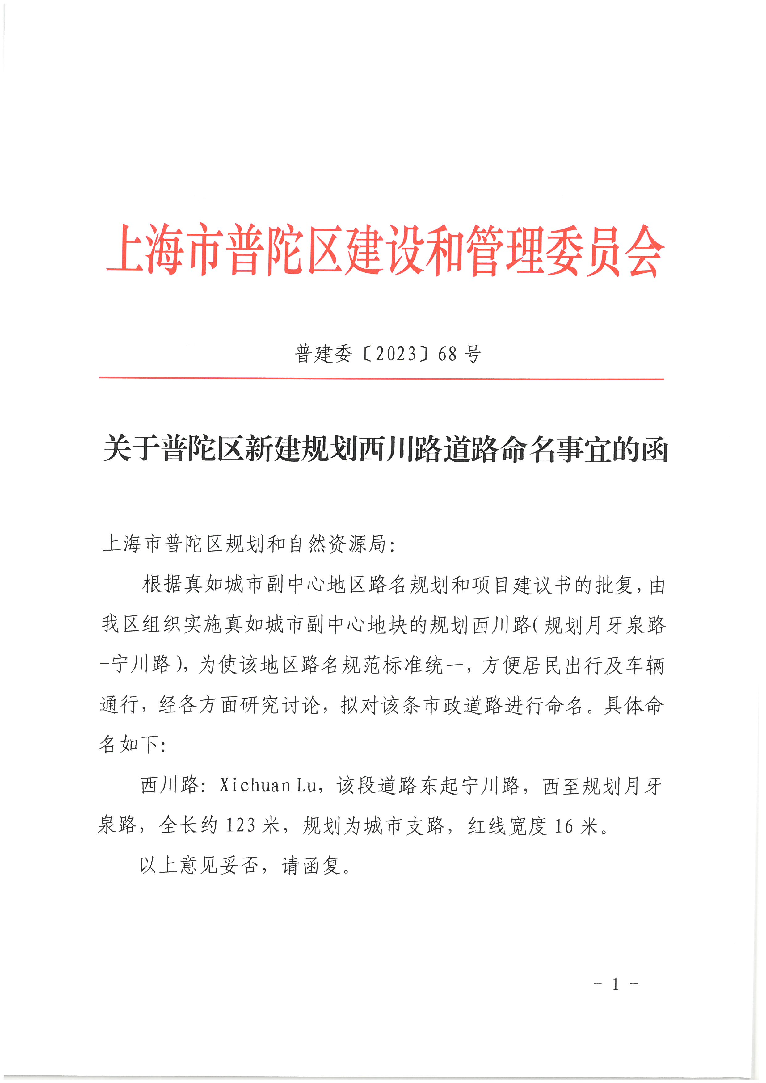 根据真如城市副中心地区路名规划和项目建议书的批复,由我区组织实施真如城市副中心地块的规划西川路(规划月牙泉路-宁川路),为使该地区路名规范标准统一,方便居民出行及车辆通行,经各方面研究讨论,拟对该条市政道路进行命名。具体命名如下: