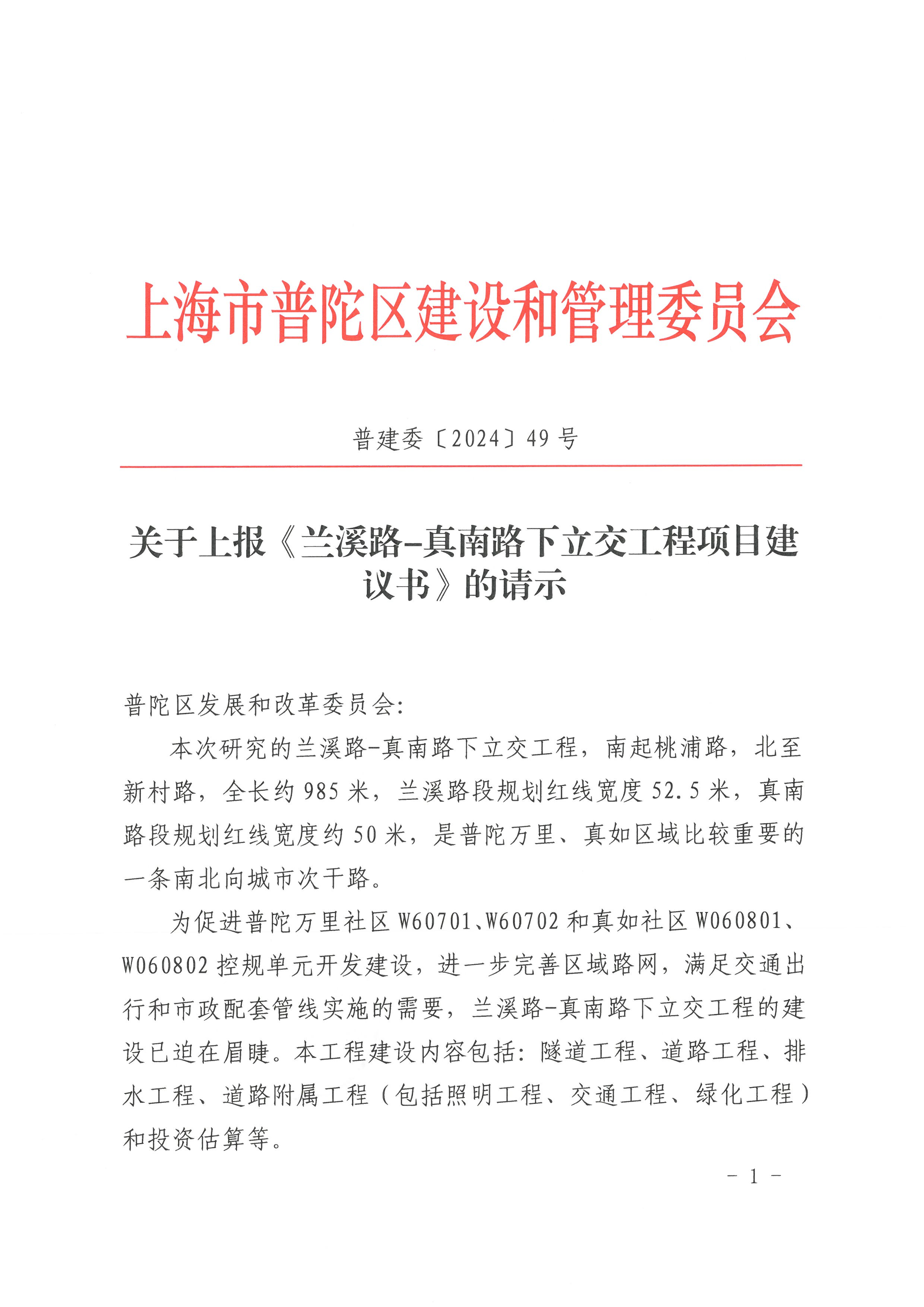 关于上报《兰溪路-真南路下立交工程项目建议书》的请示
