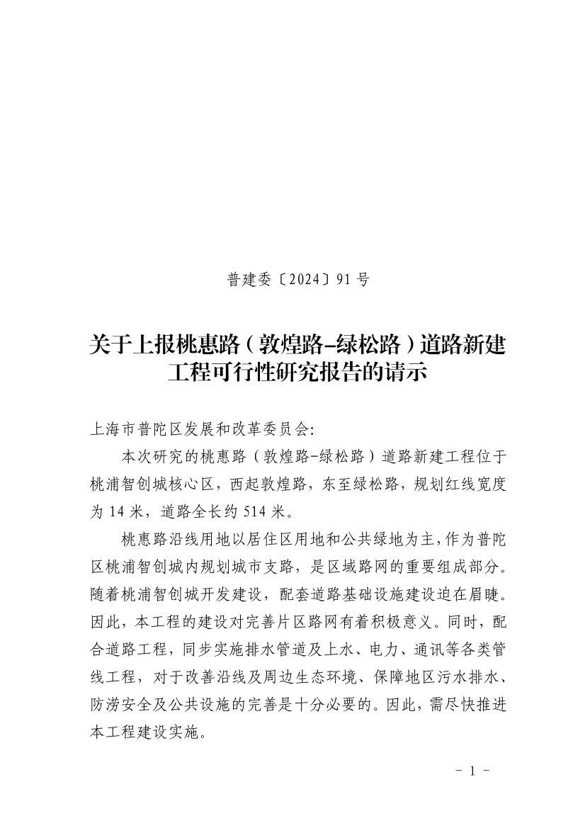根据贵委普发改投〔2024〕64号文《普陀区政府投资建设项目建议书批复表》相关要求,目前已完成《桃惠路(敦煌路-绿松路)道路新建工程可行性研究报告》的编制,工程概况如下: