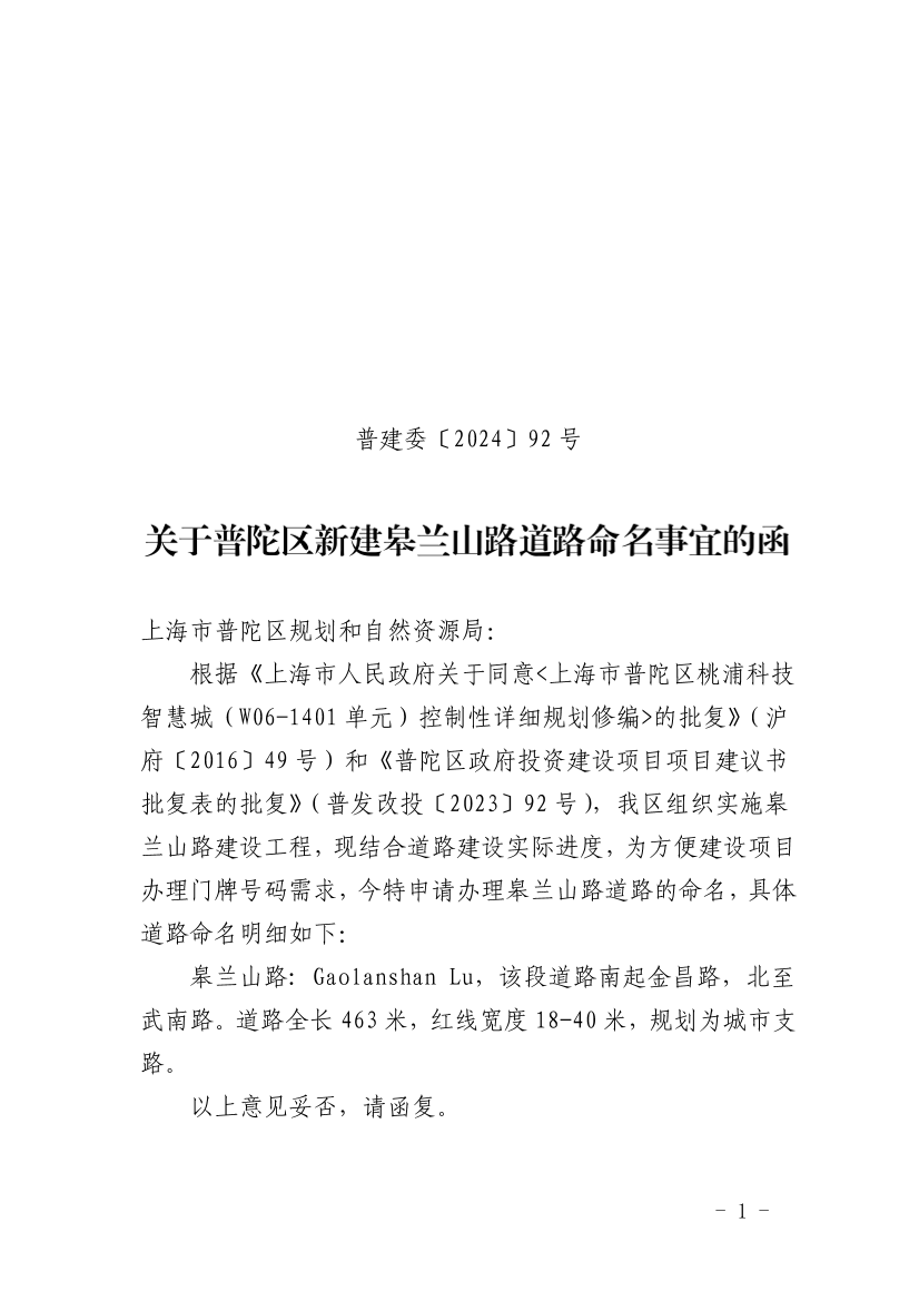 关于普陀区新建皋兰山路道路命名事宜的函
