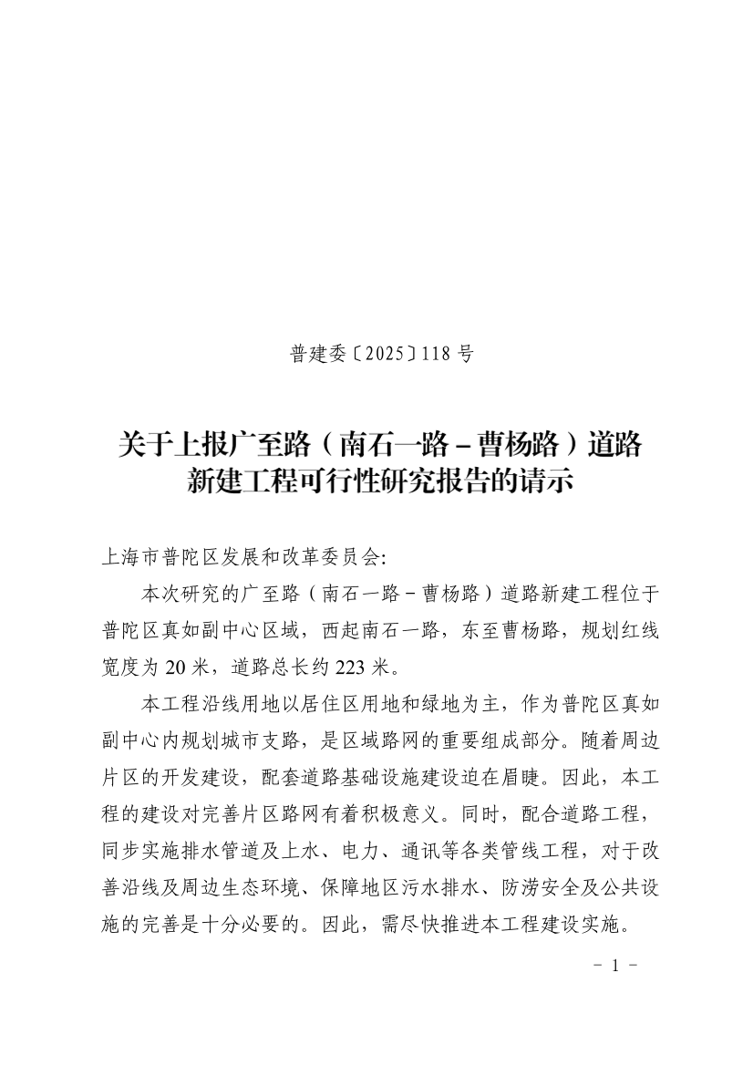 关于上报广至路(南石一路-曹杨路)道路新建工程可行性研究报告的请示