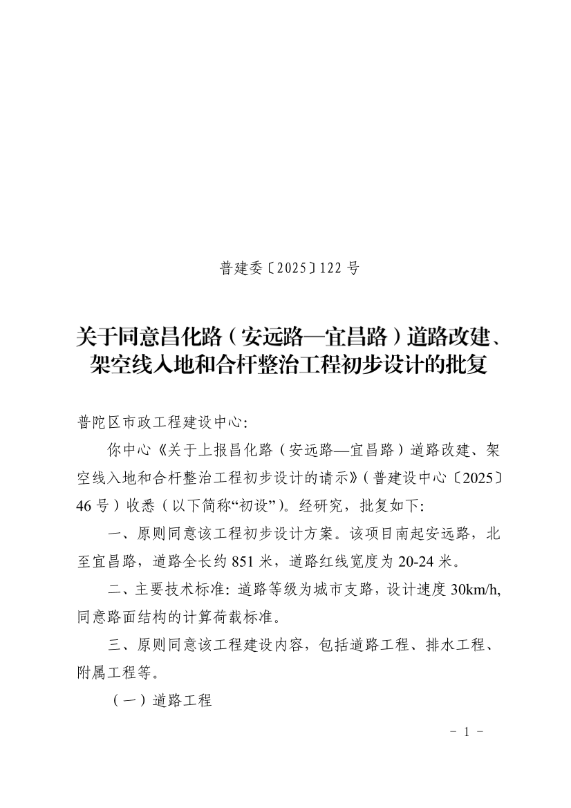 你中心《关于上报昌化路(安远路—宜昌路)道路改建、架空线入地和合杆整治工程初步设计的请示》(普建设中心〔2025〕46号)收悉(以下简称“初设”)。经研究,批复如下: