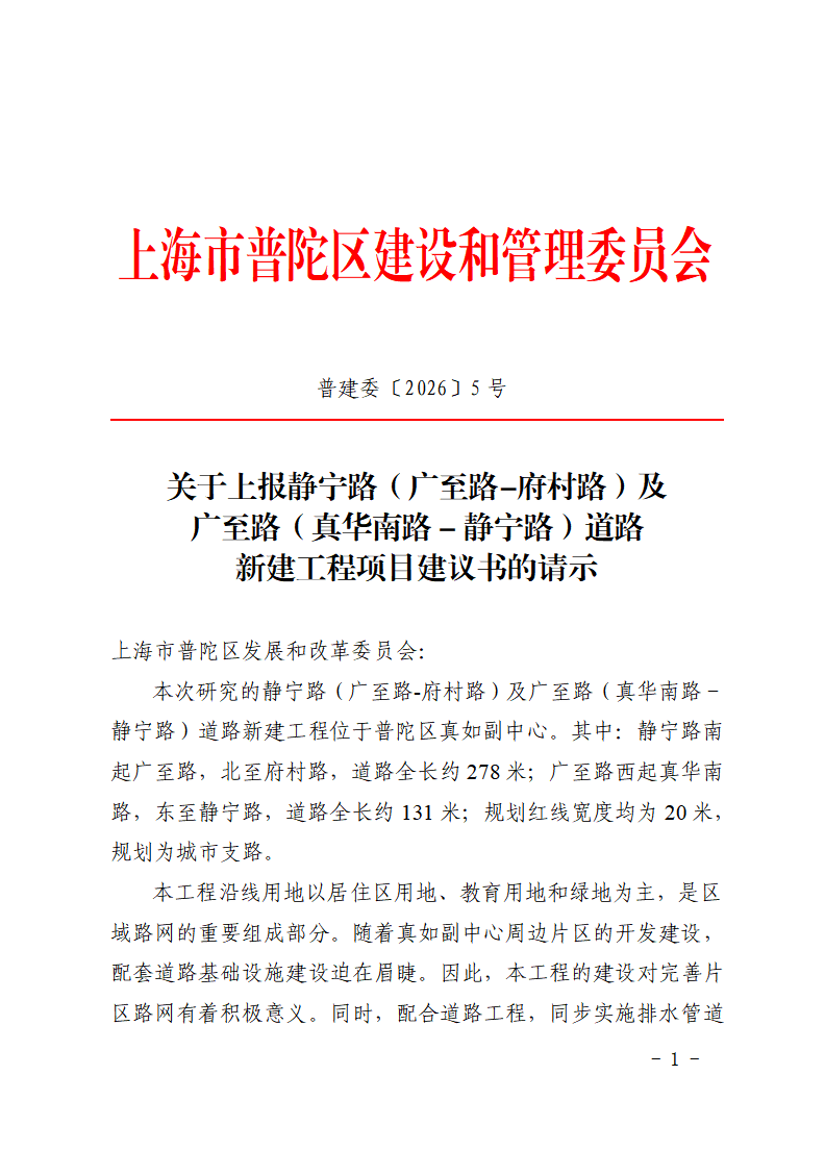 关于上报静宁路(广至路-府村路)及广至路(真华南路-静宁路)道路新建工程项目建议书的请示