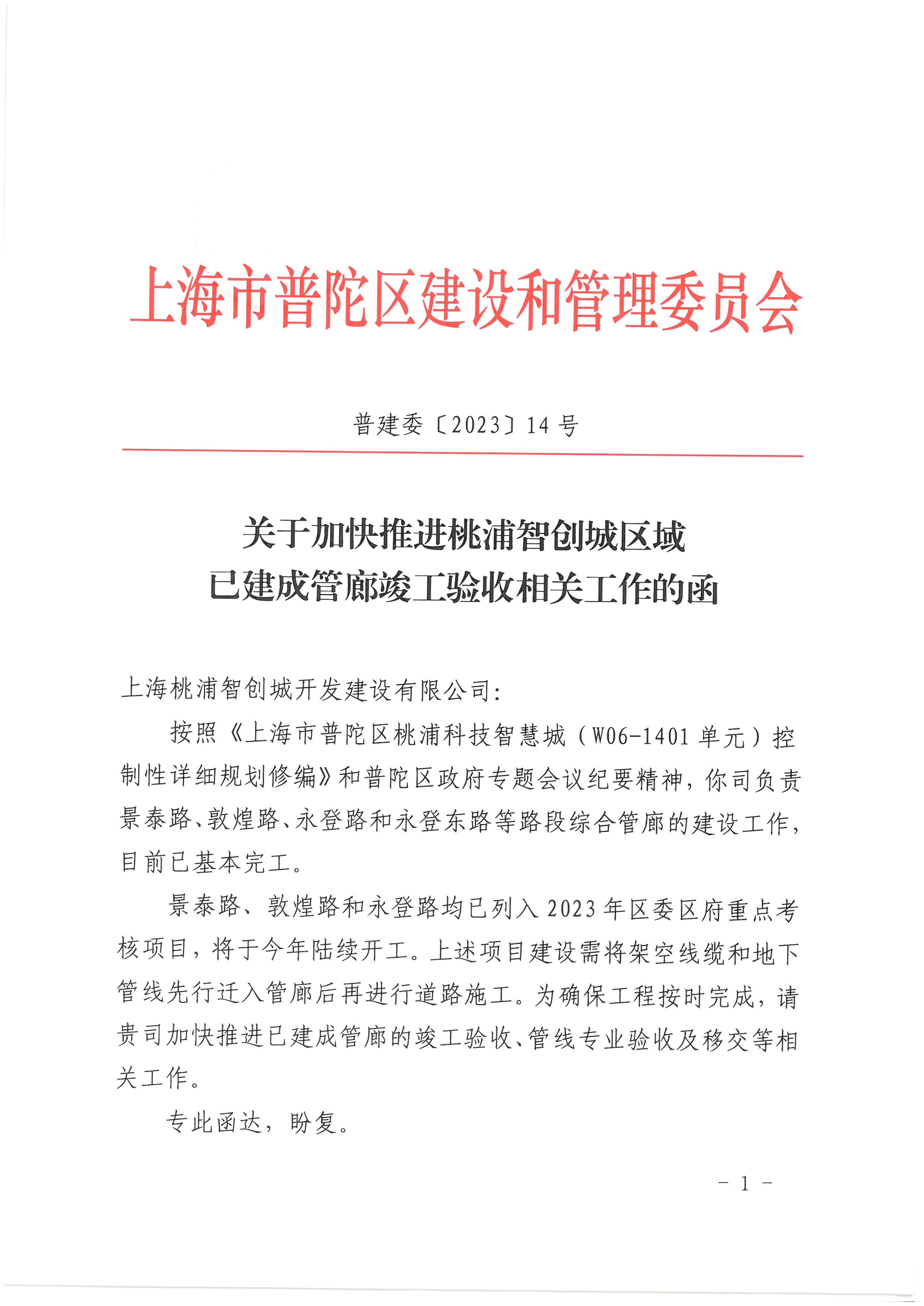 关于加快推进桃浦智创城区域已建成管廊竣工验收相关工作的函
