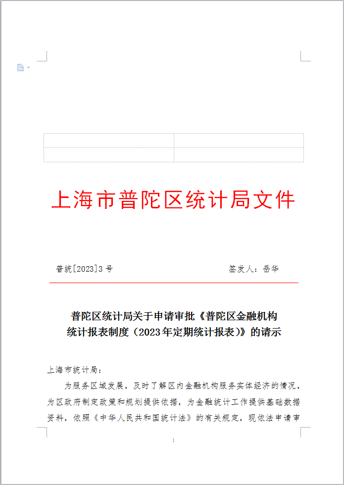 普陀区统计局关于申请审批《普陀区金融机构统计报表制度(2023年定期统计报表)》的请示