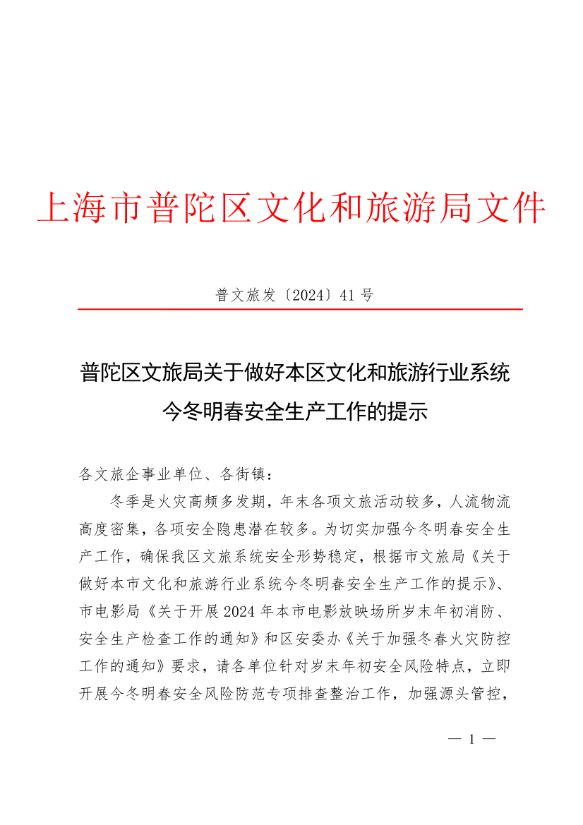 普陀区文旅局关于做好本区文化和旅游行业系统今冬明春安全生产工作的提示