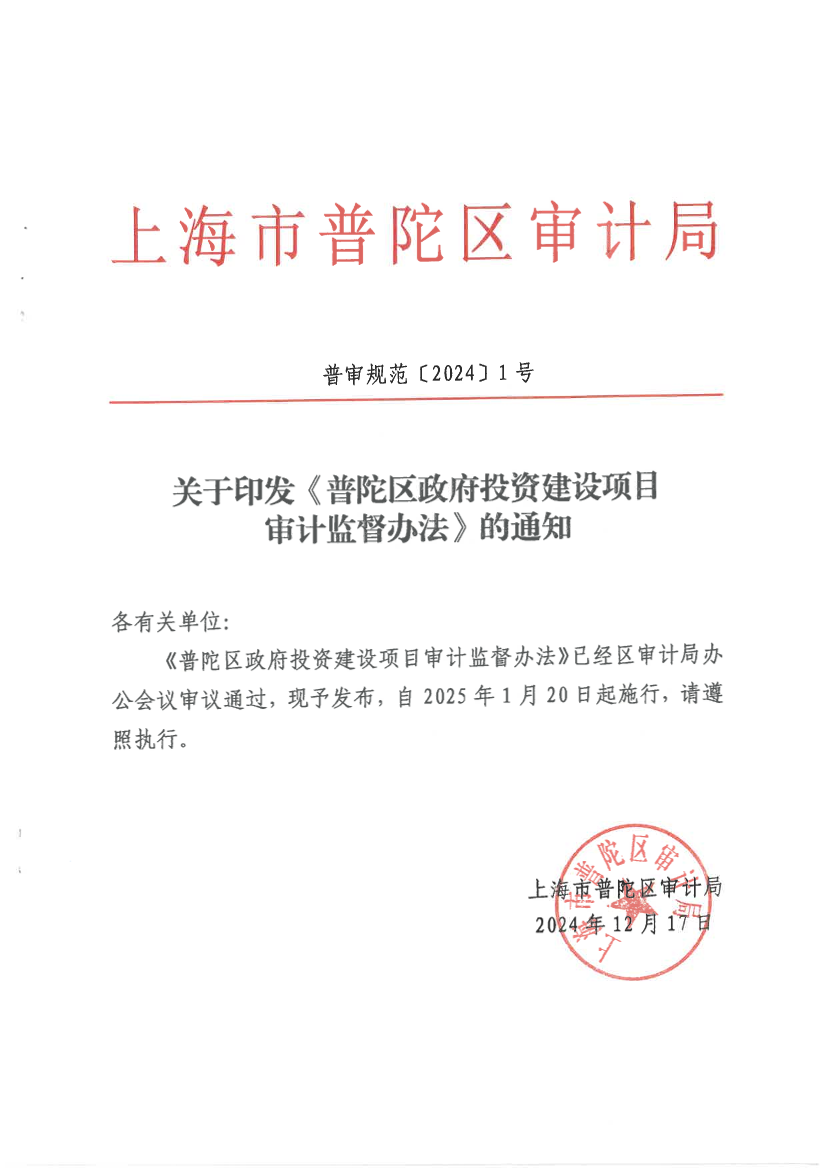 《普陀区政府投资建设项目审计监督办法》已经区审计局办公会议审议通过,现予发布,自2025年1月20日起施行,请遵照执行。