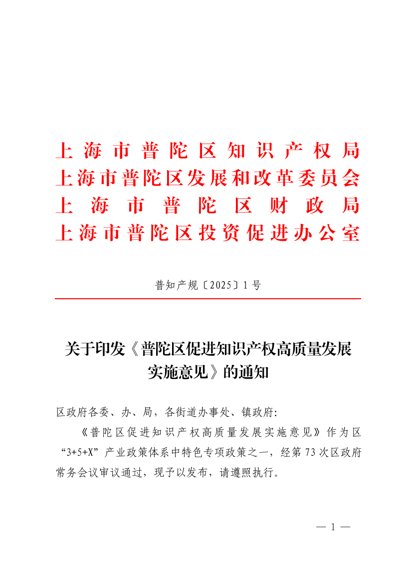 关于印发《普陀区促进知识产权高质量发展实施意见》的通知