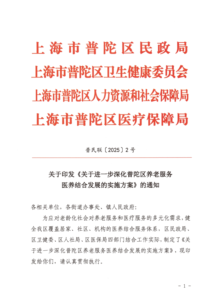 关于印发《关于进一步深化普陀区养老服务医养结合发展的实施方案》的通知