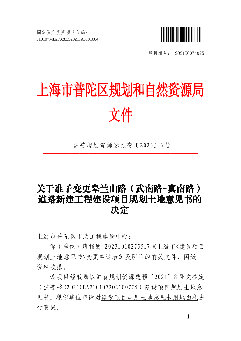 该项目经我局以沪普规划资源选预〔2021〕8号文核定(沪普书(2021)BA310107202100775)建设项目规划土地意见书。现你单位申请对建设项目规划土地意见书用地面积进行变更。
