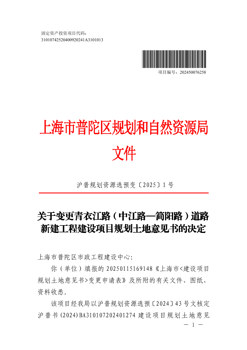沪普规划资源选预变〔2025〕1号