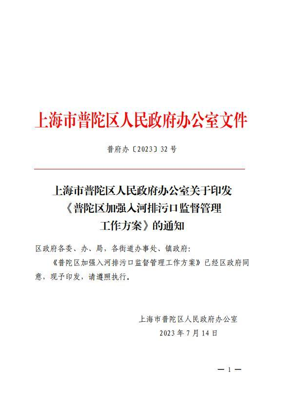 上海市普陀区人民政府办公室关于印发《普陀区加强入河排污口监督管理工作方案》的通知