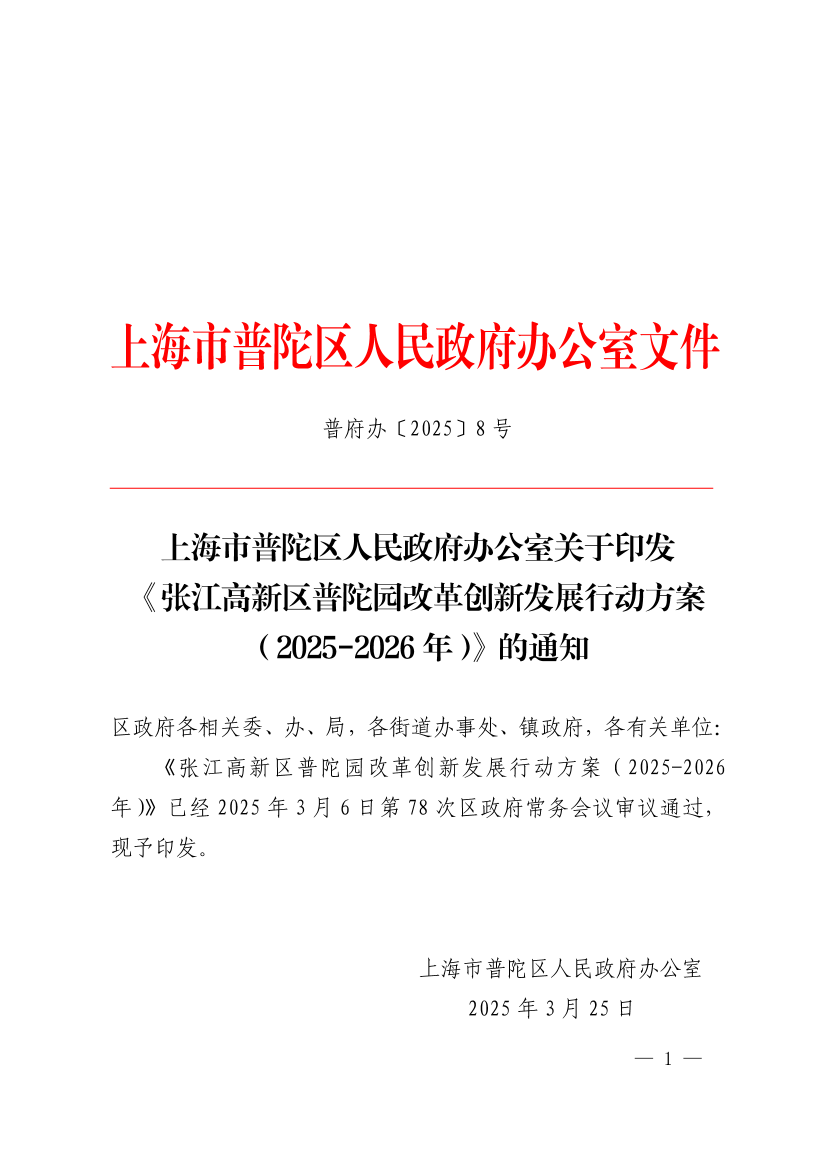 《张江高新区普陀园改革创新发展行动方案(2025-2026年)》已经2025年3月6日第78次区政府常务会议审议通过,现予印发。