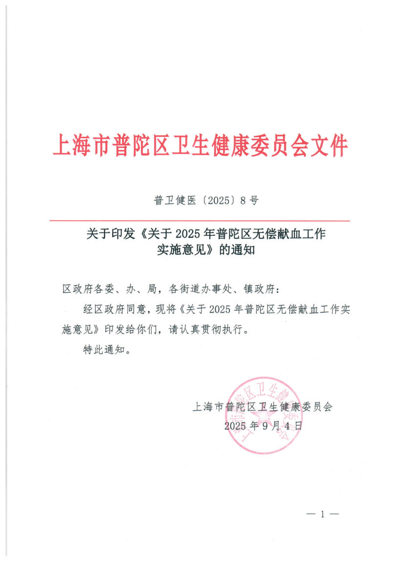 关于印发《关于2025年普陀区无偿献血工作实施意见》的通知
