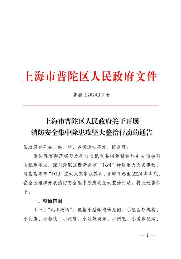 上海市普陀区人民政府关于开展消防安全集中除患攻坚大整治行动的通告