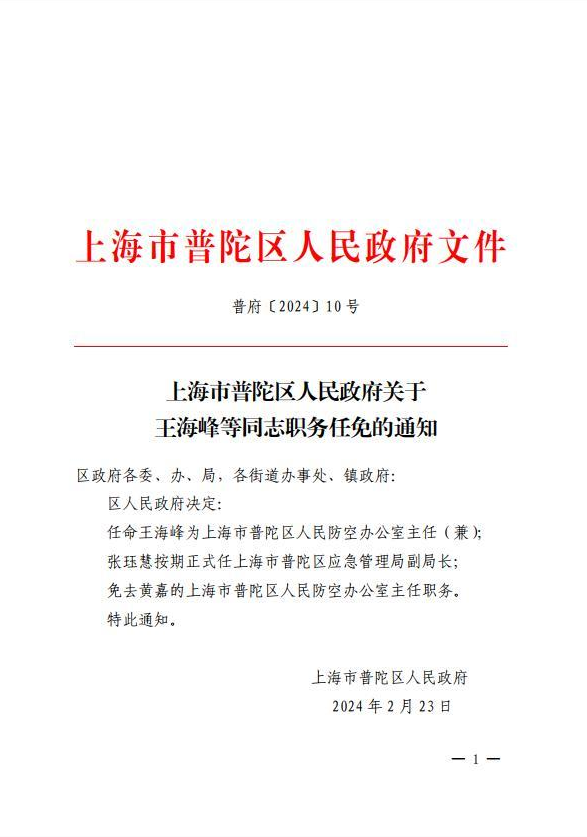 上海市普陀区人民政府关于王海峰等同志职务任免的通知