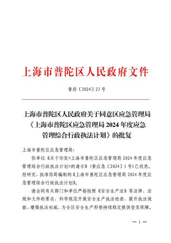 上海市普陀区人民政府关于同意区应急管理局《上海市普陀区应急管理局2024年度应急管理综合行政执法计划》的批复