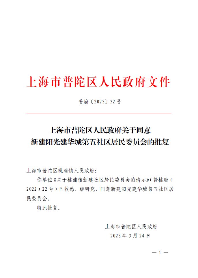 你单位《关于桃浦镇新建社区居民委员会的请示》(普桃府﹝2022﹞22号)已收悉。经研究,同意新建阳光建华城第五社区居民委员会。