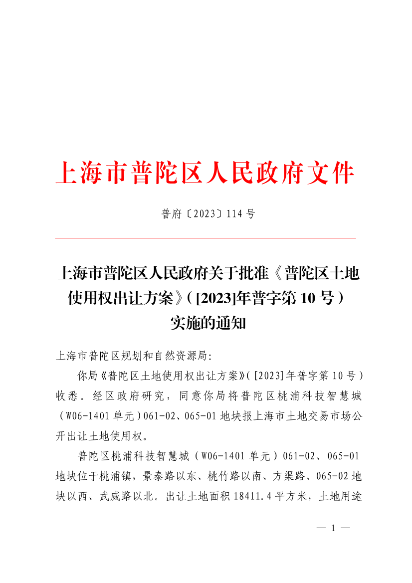你局《普陀区土地使用权出让方案》([2023]年普字第10号)收悉。经区政府研究,同意你局将普陀区桃浦科技智慧城(W06-1401单元)061-02、065-01地块报上海市土地交易市场公开出让土地使用权。