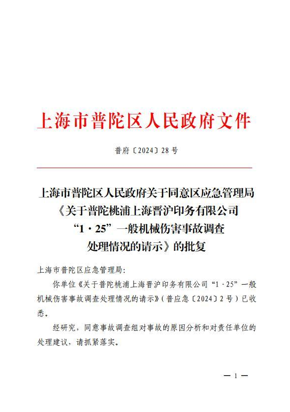 你单位《关于普陀桃浦上海晋沪印务有限公司“1·25”一般机械伤害事故调查处理情况的请示》(普应急〔2024〕2号)已收悉。