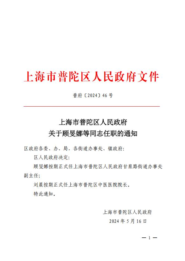 顾旻娜按期正式任上海市普陀区人民政府甘泉路街道办事处副主任;