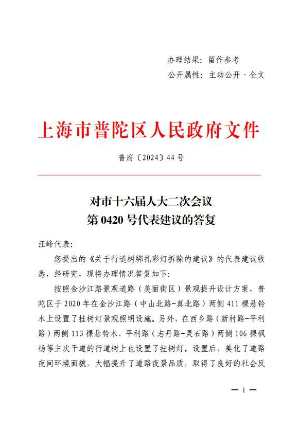收到您的代表建议后,我区加强了挂树灯的管养力度,今年三月期间,配合金沙江路行道树修剪,做好修剪现场挂树灯设施的维护,保证不影响修剪工作正常进行;在区行道树养护单位专业人员的指导下,对挂树灯进行松绑,既保证树木正常生长,又保证挂树灯设施安全美观。
