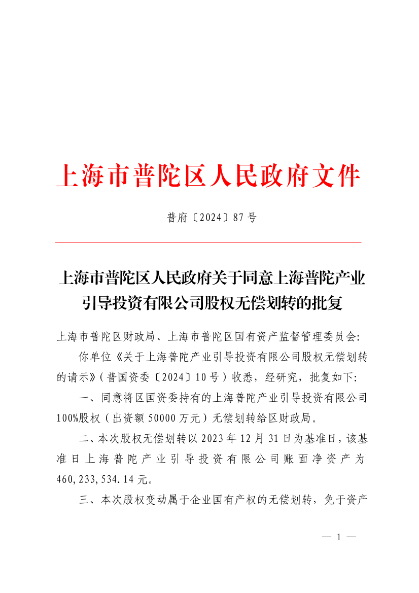 你单位《关于上海普陀产业引导投资有限公司股权无偿划转的请示》(普国资委〔2024〕10号)收悉,经研究,批复如下: