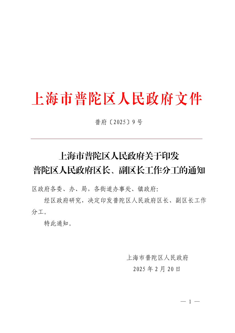 上海市普陀区人民政府关于印发普陀区人民政府区长、副区长工作分工的通知