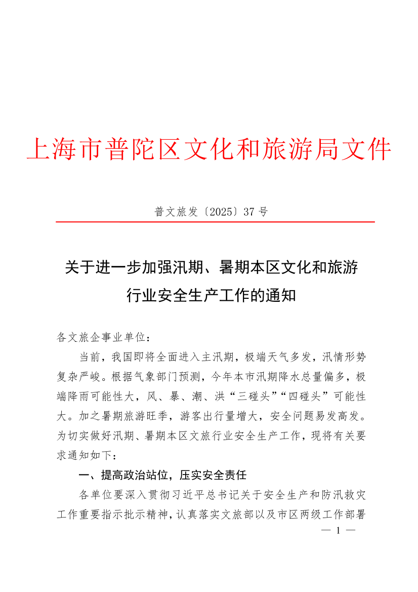 当前,我国即将全面进入主汛期,极端天气多发,汛情形势复杂严峻。根据气象部门预测,今年本市汛期降水总量偏多,极端降雨可能性大,风、暴、潮、洪“三碰头”“四碰头”可能性大。加之暑期旅游旺季,游客出行量增大,安全问题易发高发。为切实做好汛期、暑期本区文旅行业安全生产工作,现将有关要求通知如下: