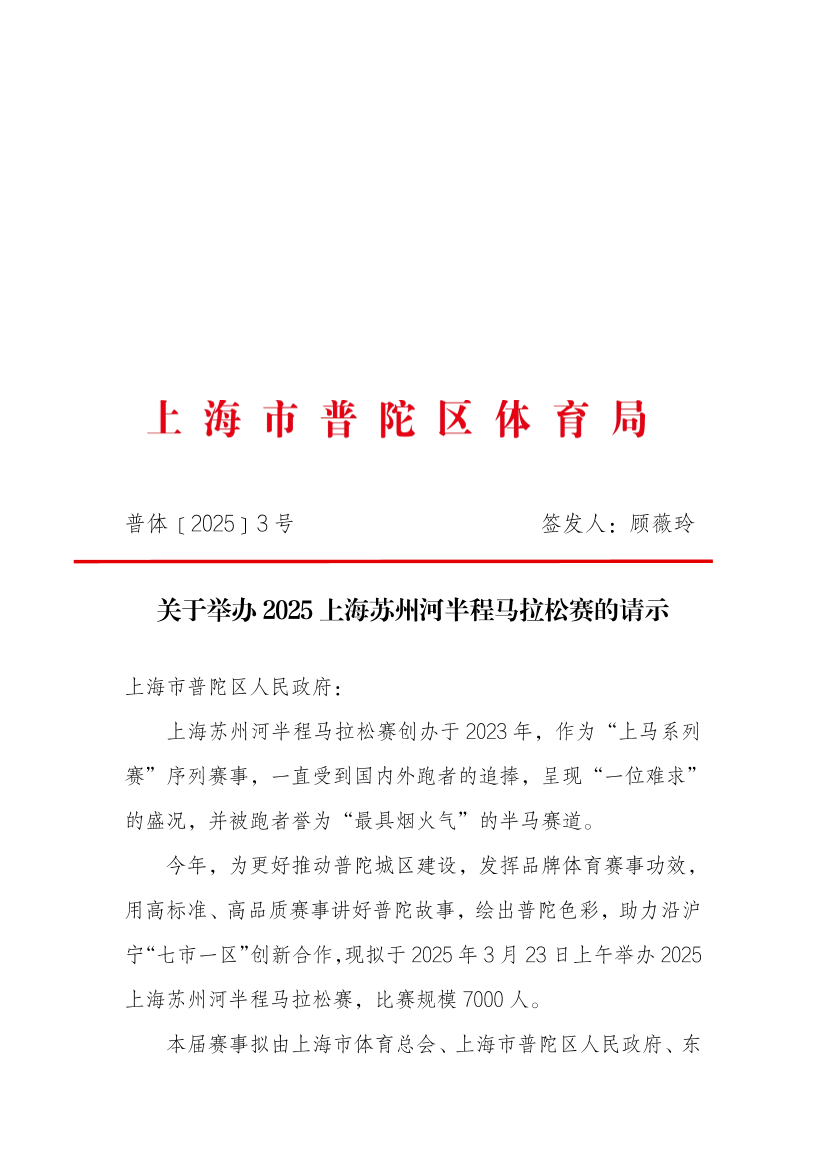 今年,为更好推动普陀城区建设,发挥品牌体育赛事功效,用高标准、高品质赛事讲好普陀故事,绘出普陀色彩,助力沿沪宁“七市一区”创新合作,现拟于2025年3月23日上午举办2025上海苏州河半程马拉松赛,比赛规模7000人。