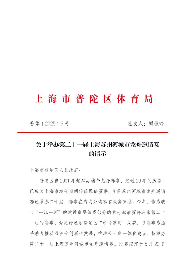 关于举办第二十一届上海苏州河城市龙舟邀请赛的请示