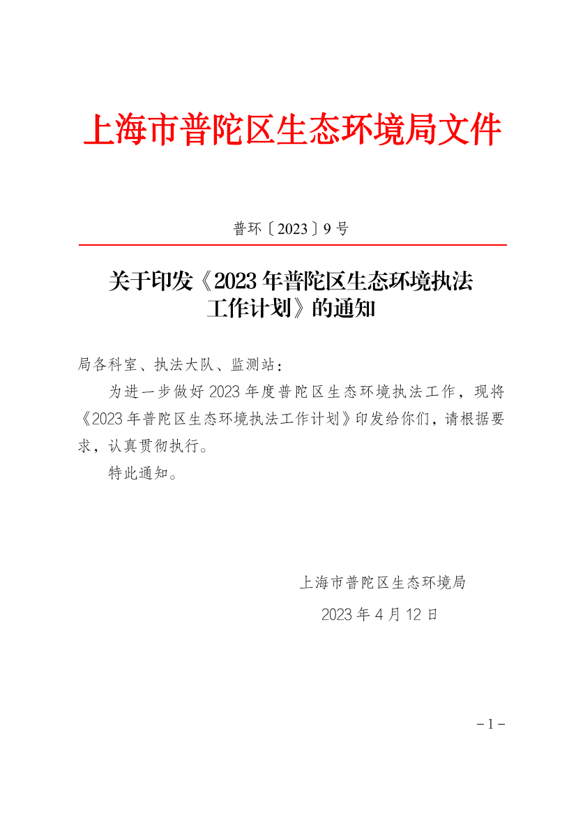 关于印发《2023年普陀区生态环境执法工作计划》的通知