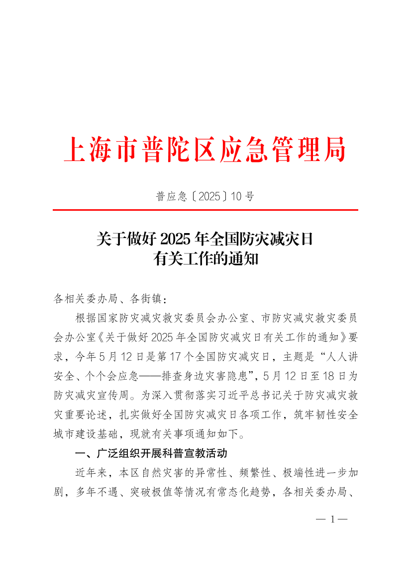 根据国家防灾减灾救灾委员会办公室、市防灾减灾救灾委员会办公室《关于做好2025年全国防灾减灾日有关工作的通知》要求,今年5月12日是第17个全国防灾减灾日,主题是“人人讲安全、个个会应急——排查身边灾害隐患”,5月12日至18日为防灾减灾宣传周。为深入贯彻落实习近平总书记关于防灾减灾救灾重要论述,扎实做好全国防灾减灾日各项工作,筑牢韧性安全城市建设基础,现就有关事项通知如下。