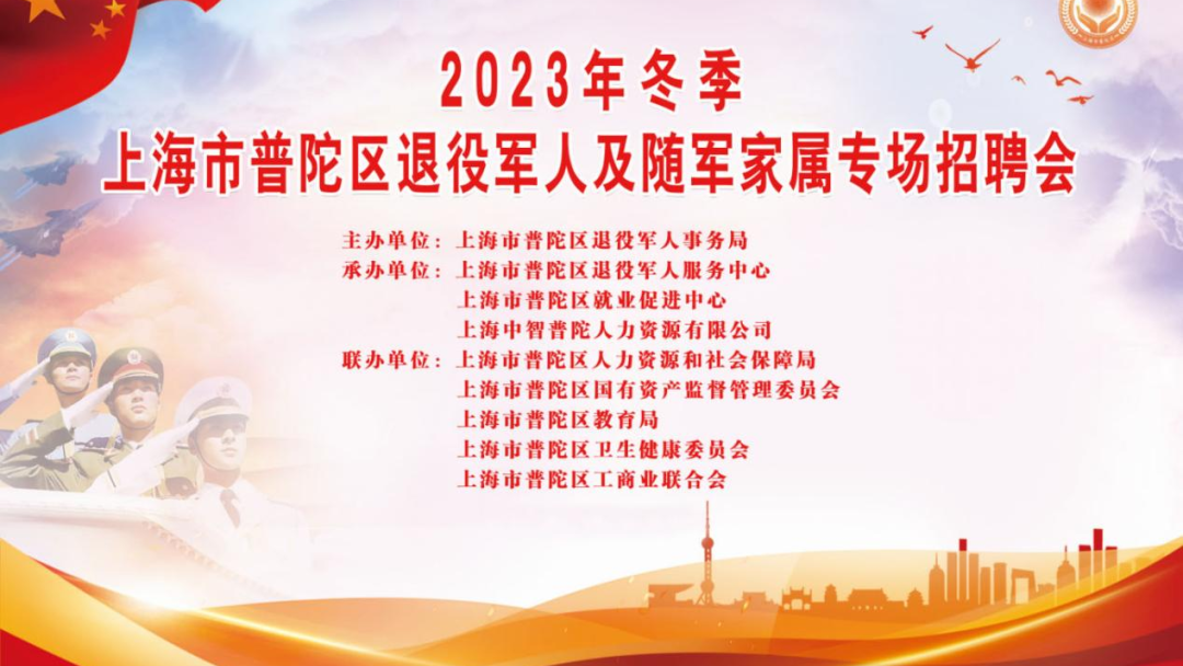 为贯彻落实《关于促进新时代退役军人就业创业工作的意见》精神,满足退役军人高质量就业需求,11月22日,由普陀区退役军人局、区人社局、区国资委、区教育局、区卫健委、区工商联联合主办,区退役军人服务中心、区就业促进中心、中智普陀人力资源有限公司承办的2023年普陀区退役军人及随军家属冬季专场招聘会在普陀区就业促进中心成功举办。