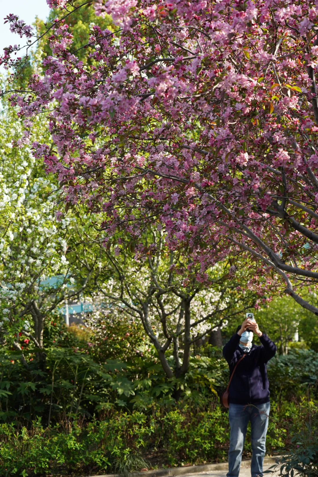 花朵在枝头尽情盛放,行人不禁把手机高高举过头顶,只为记录这五彩缤纷的绚丽春景。