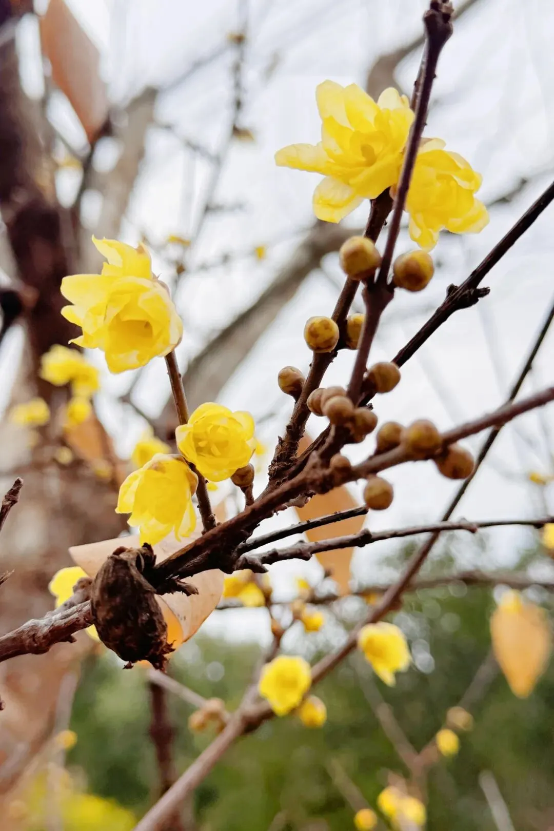 蜡梅并非人们常说的梅花,而是属于蜡梅科,是一种落叶灌木,因其花色似蜜蜡、质感如蜡而得名。其花期通常从冬季延续至早春,正值万物萧瑟之时,蜡梅却凌寒开放,散发淡淡香气,仿佛预告着春天即将到来。如今在真如公园,这缕梅香正吸引着往来游客驻足欣赏。