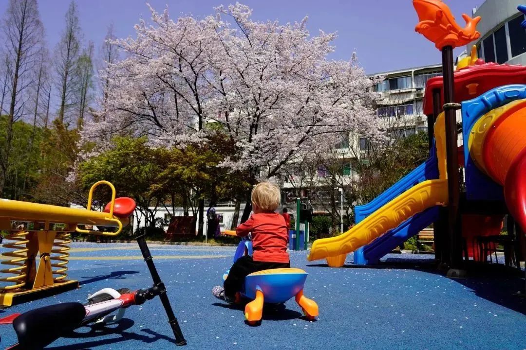 而在不远处的北石路樱花苑小区中心广场上,一株来自日本的大型樱花树正值盛放。阳光透过层层叠叠的粉白花瓣,为树下追逐嬉戏的孩子们披上暖暖的金纱,点亮人们心中对美好生活的向往。