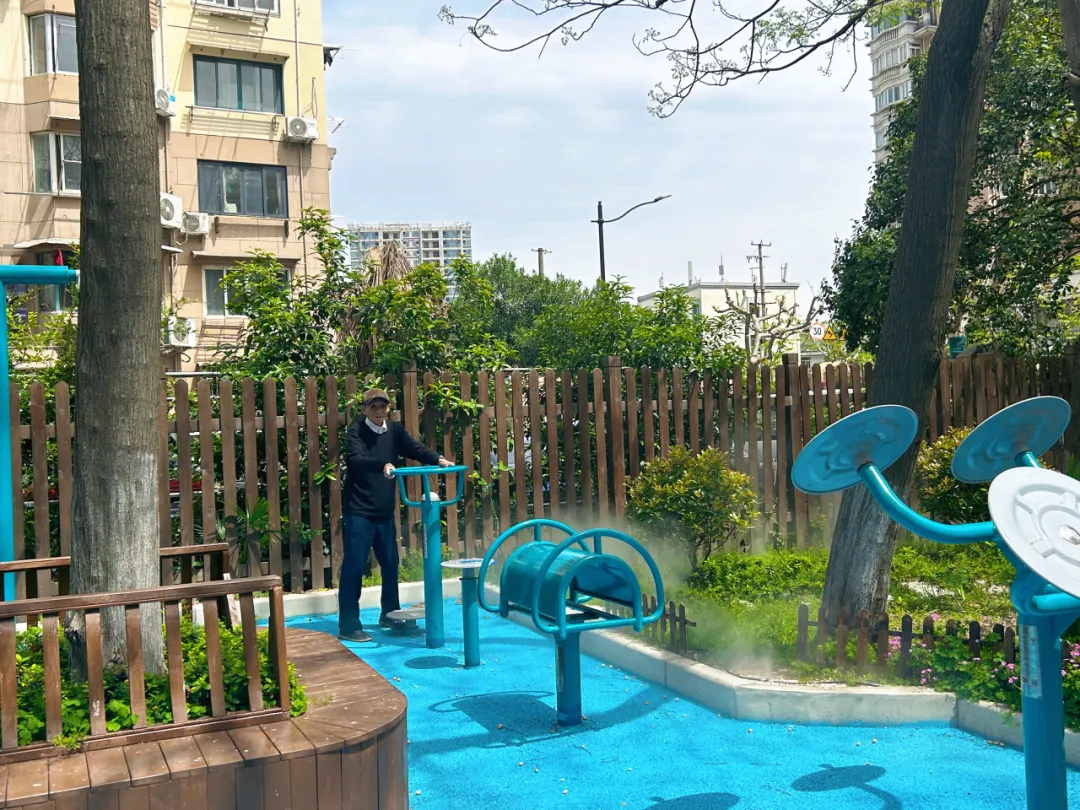 历经前后4次调整设计方案后,如今小区益智健身点的功能得到重新布局设计,不再紧邻马路,并新增了雾化系统起到降尘、灌溉及夏日降温作用,美观度上也得到了提升。