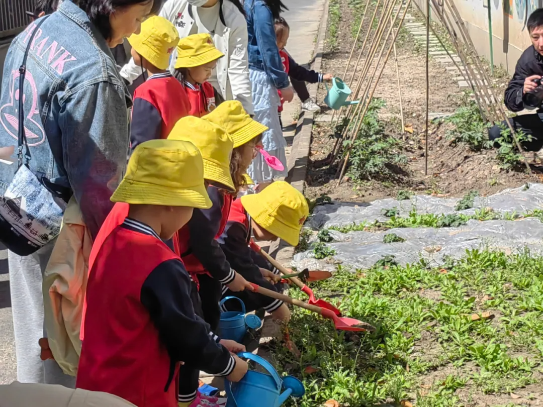 “哇~原来西红柿的树是这样子的!”“这是辣椒苗苗。”孩子们在生机勃勃的农场里奔跑穿梭,每一株植物都让他们发出惊叹。在老师的讲解下,他们认识了茄子、辣椒等农作物,看到了树上的柑橘,了解了这些作物的生长特点,懂得了每一餐的珍贵。他们还拿起铲子、水壶为作物们松土、浇水,参与基础的农事劳作,撒播下热爱劳动、热爱自然的种子。