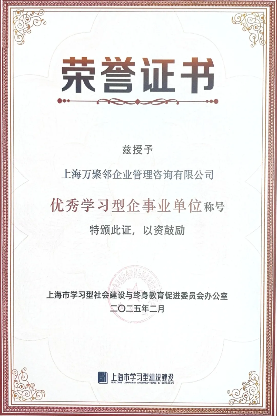 近日,上海市学习型社会建设与终身教育促进委员会办公室公布了2024年上海市优秀学习型组织名单。经层层推荐及专家评审,由真如镇街道总工会推荐的上海万聚邻企业管理咨询有限公司(以下简称“万聚邻”)脱颖而出,荣获上海市“优秀学习型企事业单位”称号。