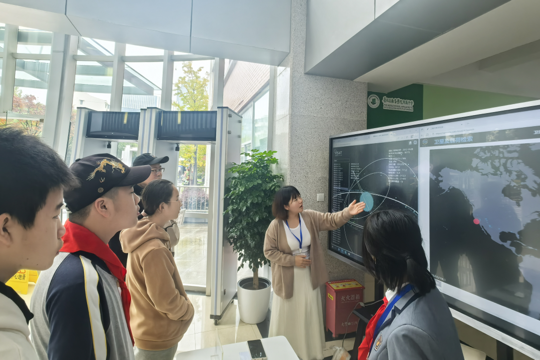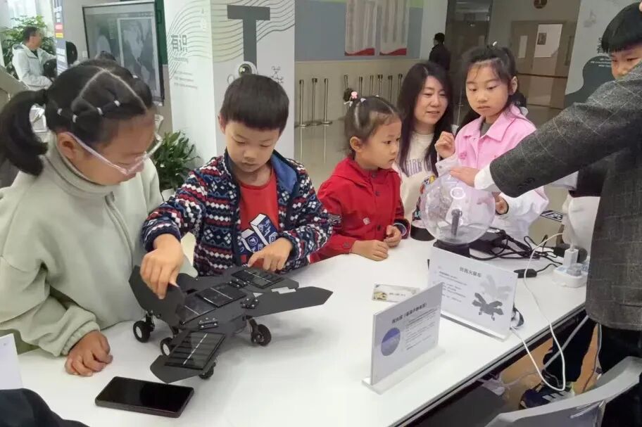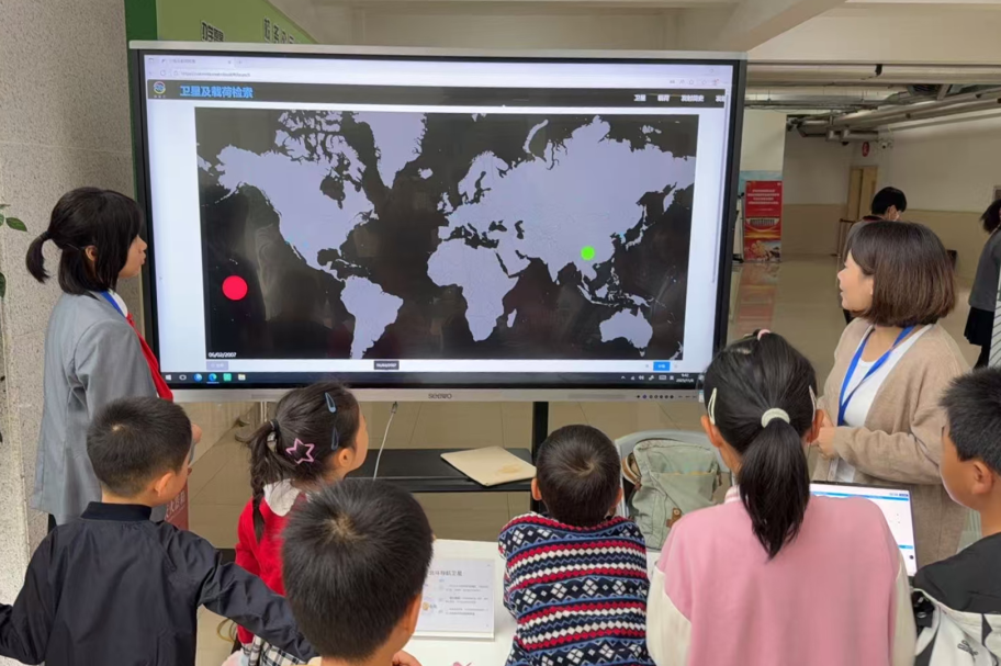 在仿真遥感卫星摊位,孩子们在街道志愿者和学校老师的共同引导下,亲手调整卫星模型姿态,观察数据变化。