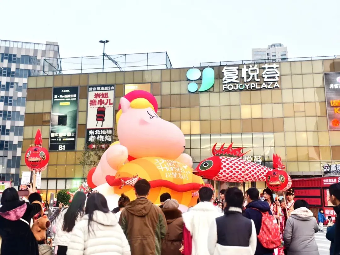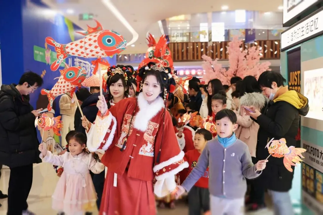 1月24日,首场巨型鱼灯巡游启动。身着汉服的大小朋友们手持鱼灯,随着悠扬的民俗乐曲缓步前行。巡游队伍穿游在商场的中庭与户外广场,时而列队成灵动的鱼群造型,时而驻足互动,向沿途观众挥手致意,不少游客纷纷驻足打卡、跟随前行,商场里满是热闹祥和的新春年味。