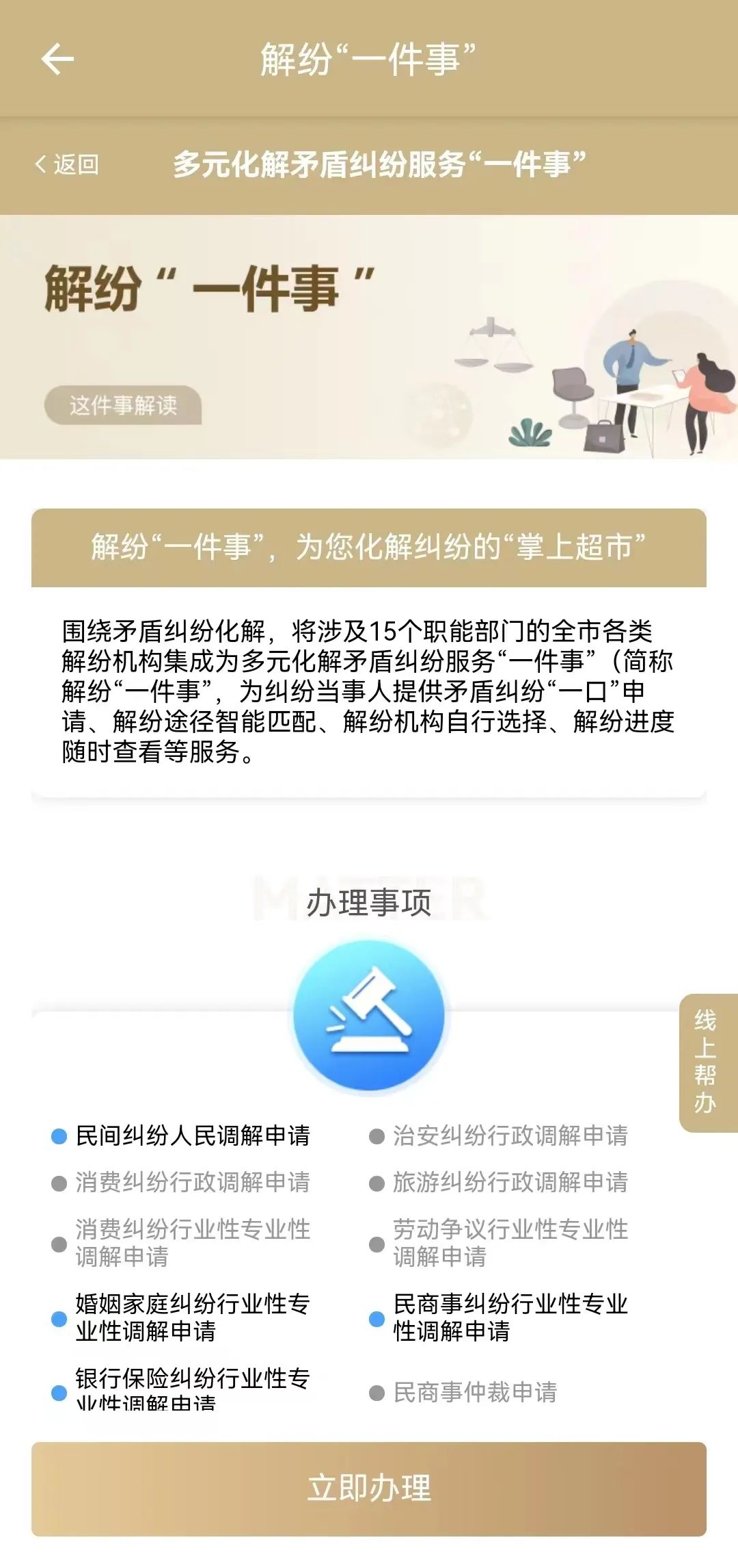 抢抓全市“一网通办”流程再造契机,以推进多元化解矛盾纠纷“一件事”为抓手,优化司法局“智慧调解”平台与法院“一站式多元解纷”平台、公安“110”接处警平台的联通机制,深化诉源治理,探索繁简分流,初步实现“人民调解、行政调解、司法调解”一网通调、一网解纷。目前,群众可以直接在“随申办”搜“解纷一件事”,选择调解组织,提交解纷申请后,工单同步到“智慧调解”平台,1个工作日内就有工作人员联系当事人,3个工作日内决定是否受理。如案情清楚、双方自愿调解,小半天就能解决问题。即使最终调解未能达成一致,当事人仍可选择其他纠纷解决途径。仅今年1月至7月,通过“解纷一件事”线上共调处矛盾纠纷1690件,线上调解率跃升至15%, 调解成功1618件,调解成功率96%,灵活便捷有效的线上调解方式逐步被群众所接受。