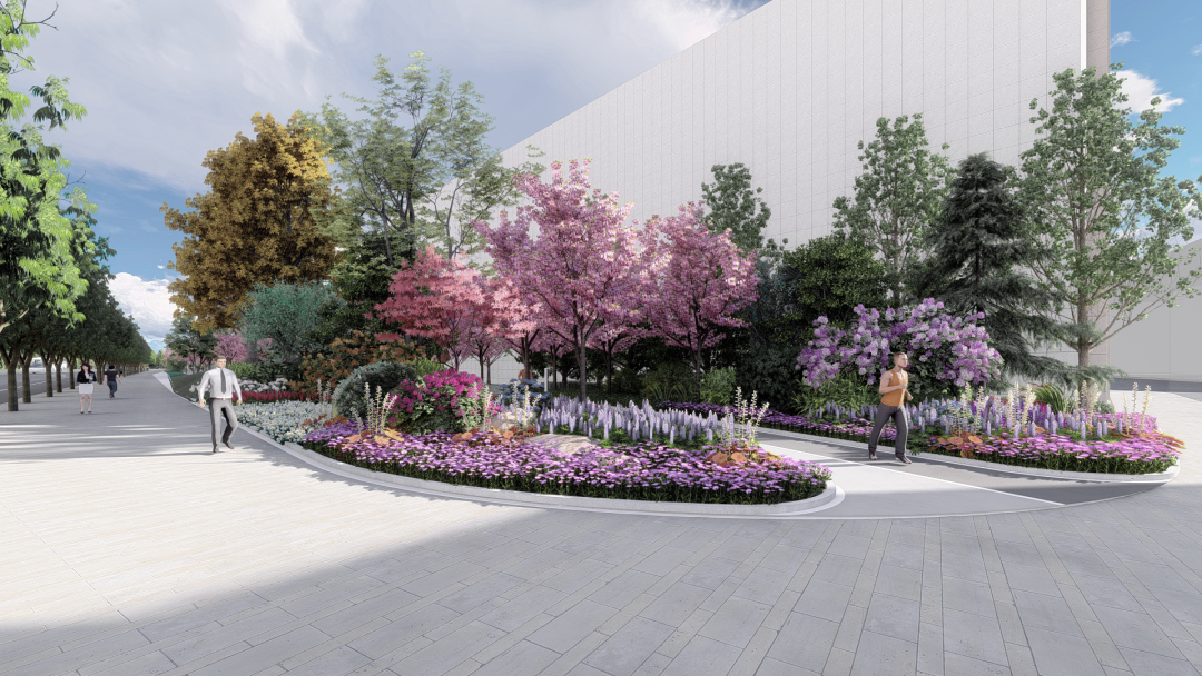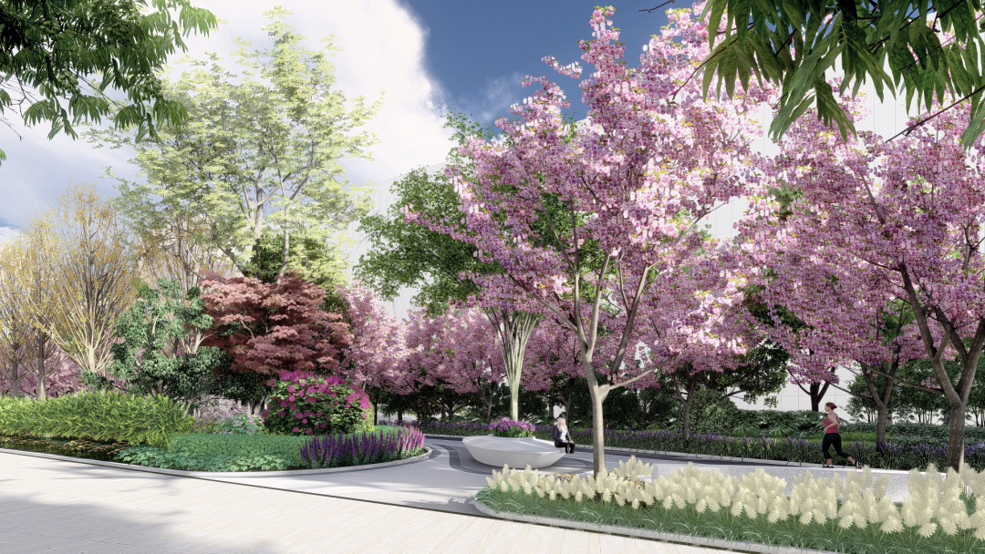 多层次,重搭配 在狭长用地的条件下形成高低错落、层次丰富的景观空间。通过树种搭配,形成以背景林带、色叶景观带、形象展示带为核心的三重景观界面。结合特选大树、疏林草地和花镜组团的疏密搭配,常绿与落叶的对比效果,打造银杏、樱花为主题的漫步景观道,体现春花秋叶、季相变化的自然景观。在改善生态环境、实现低碳发展的同时创造具有区域特色的城市绿色开放空间。