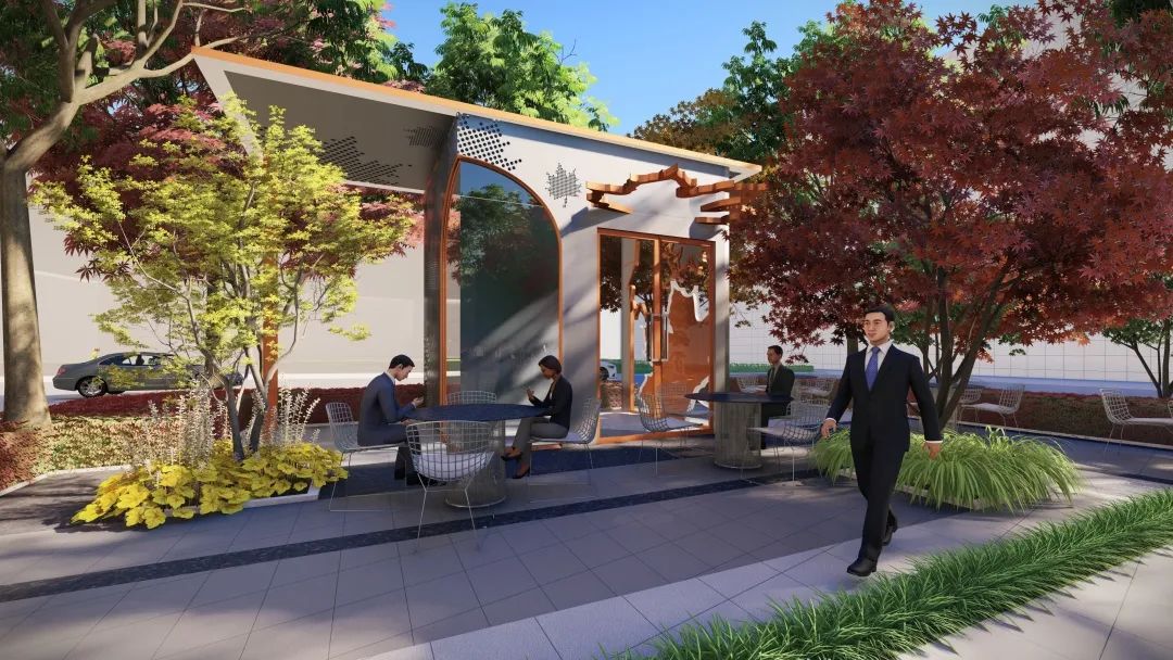 强功能,显智创 公共绿地的建设从根本上提升区域内生态绿化环境,整合功能空间,提升绿地开放性与渗透性,推动建设人、自然和谐共生的生态活力空间。以智慧、创新作为抓手,融入具有科技感小品构筑物,打造可互动、可呼吸的智能化景观空间,赋能区域发展,增色低碳城区。 金昌路绿化景观工程为融合城市景观与绿色生态于一体的门户景观,漫步其间,绿化成荫,通过营造桃浦智创城南侧产业区域的优美环境,打造人才向往的“诗和远方”,助力桃浦智创城产业集聚。
