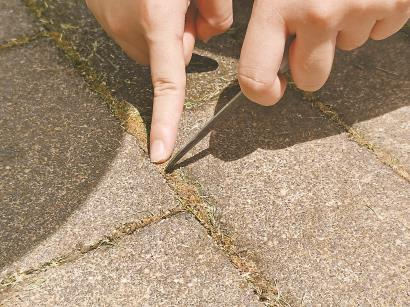 图1、图2 调查人员在公园步道的透水砖缝内采集到红蒴真藓